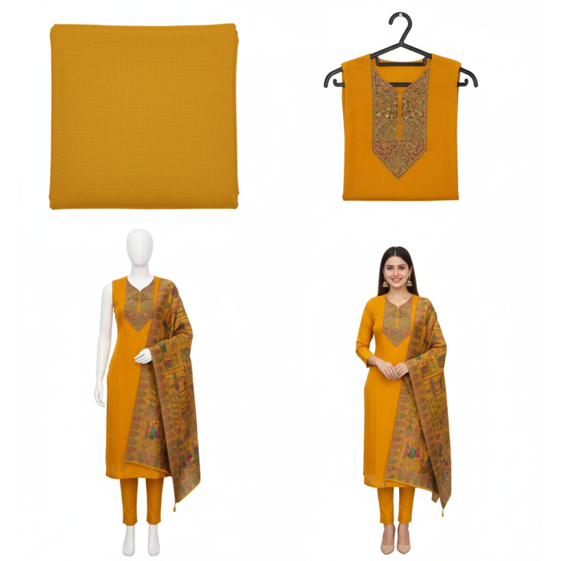 Product Name: "Turmeric Yellow Pashmina Bloom" or "Kashmiri Gold Silk Set" Target Price: ₹3,499 (..