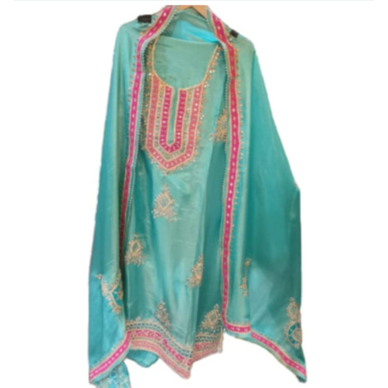| Embellishment (Assumed) | The set is likely finished with delicate Zari (gold/silver thread) work, Gota Patti, or fine Sequins/Mirror Work on the neckline and dupatta to justify the price. |