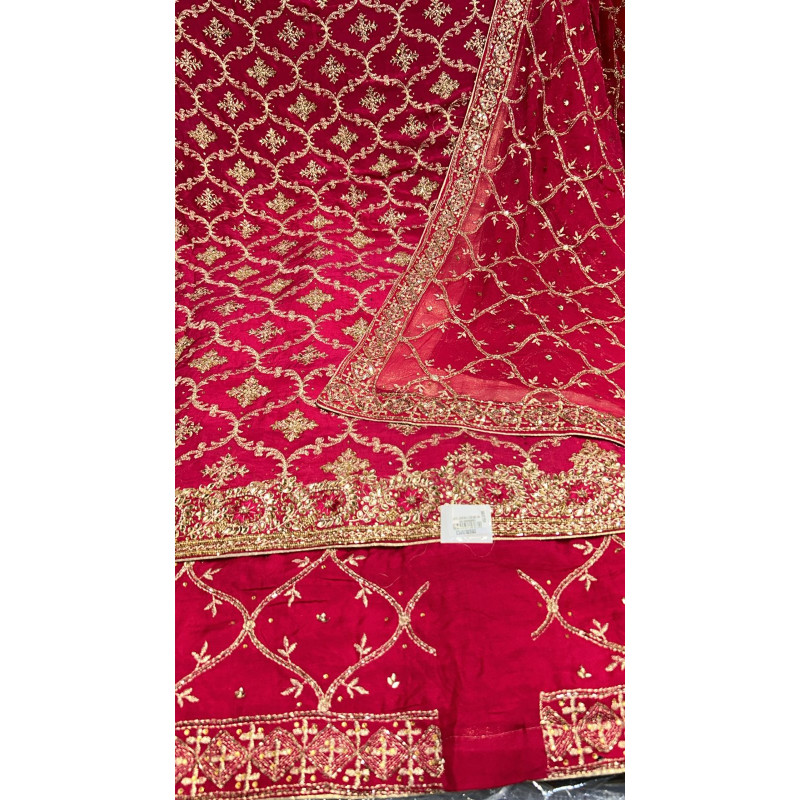 Technique: The gold work is likely Zari or Zardozi embroidery, a traditional Indian hand-embroidery technique that uses metallic thread. Given the heavy look, it may also incorporate sequins, beads, or dabka work.