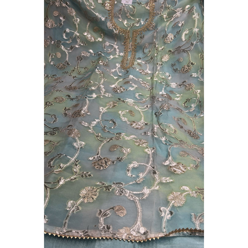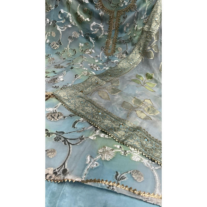 lColour Aqua Blue / Sea Green Ombré (A vibrant transition from one shade of light blue-green to another, or a solid, bright aqua/sea green tone).Fabric (Top & Dupatta)Pure / Silk Organza (Indicated by the sheer, crisp, and shimmering quality, providing a luxurious, flowing drape).Fabric (Bottom)Plain Silk / Art Silk (As requested, a solid, non-embroidered fabric like Pure Silk, Raw Silk, or Art Silk, typically in a matching or complementary color for trousers/salwar).Work on Top (Kurta/Kameez)Heavy Floral Embroidery with Sequins and Cutwork: Features dense, intricate floral or Jaal (lattice) embroidery, likely using silver or white thread (Zari/Resham) with sparkling sequins or tiny stones (Cut-Dana). The hemline and neckline likely feature heavy, ornate cutwork borders.Work on DupattaFour-Side Cutwork Border & Scattered Bootis: The dupatta fabric is highly decorative, featuring the same exquisite cutwork lace border on all four sides, with delicate, scattered embroidered floral motifs (bootis) throughout the sheer field.Price₹4400 (This price point is suitable for a premium unstitched suit material featuring a genuine organza silk top/dupatta and a silk blend bottom with intricate, heavy machine-embroidered work).