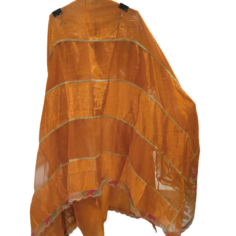 Colour Vibrant Marigold Orange or Deep Yellow-Orange. The color is rich and shiny, perfect for festive occasions.FabricSuit (Kameez): Likely a Chanderi Silk, Art Silk, or a rich Organza/Chinon blend. The fabric has a natural sheen and a slightly crisp texture, which allows the suit to hold its shape well.Embroidery/WorkThe suit features heavy, colorful floral embroidery (possibly Resham thread work) concentrated around the neckline and in a prominent motif on the side/hip area. The neck has a delicate finished border. Bottom Plain Marigold Orange fabric (as indicated in your request). This is typically Santoon, Cotton Silk, or Crepe to provide a comfortable base beneath the rich Kurta.Dupatta Matching Marigold Orange with a unique texture, possibly Crushed or Tissue Silk. It is heavily adorned with: <ul><li>Multiple parallel horizontal lines of thin Gota Patti or Zari lace (as seen in the second image).A wide, intricately embroidered floral border along the edges, mirroring the work on the suit (as seen in the first image).