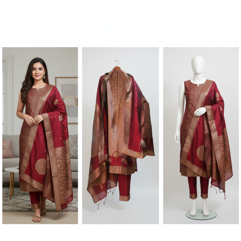 Colour & Fabric: The dominant colour is a rich, deep Maroon or Wine Red. The Kameez (suit) fabric is a heavy, glossy Silk or Art Silk with a visible shimmer, often referred to as Brocade or Banarasi Silk due to the woven gold pattern.