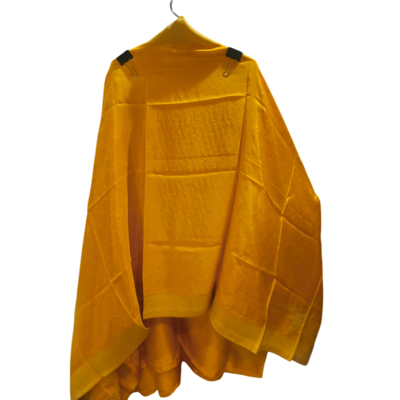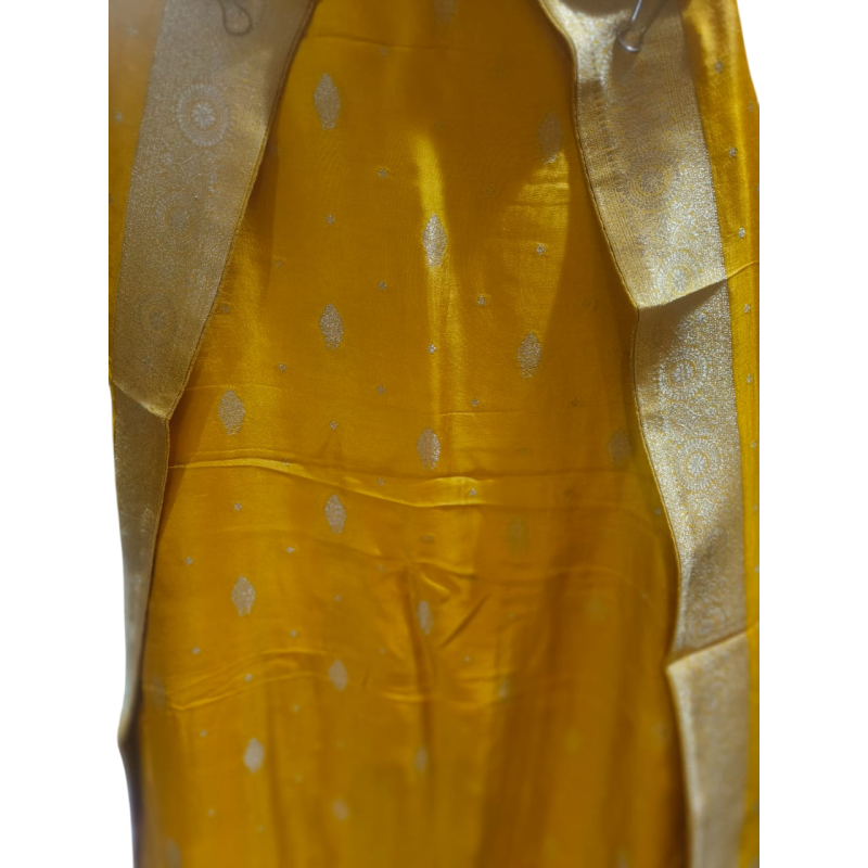 Kurta/Top: Solid Yellow fabric with subtle gold zari bootis (small motifs) woven throughout the body.