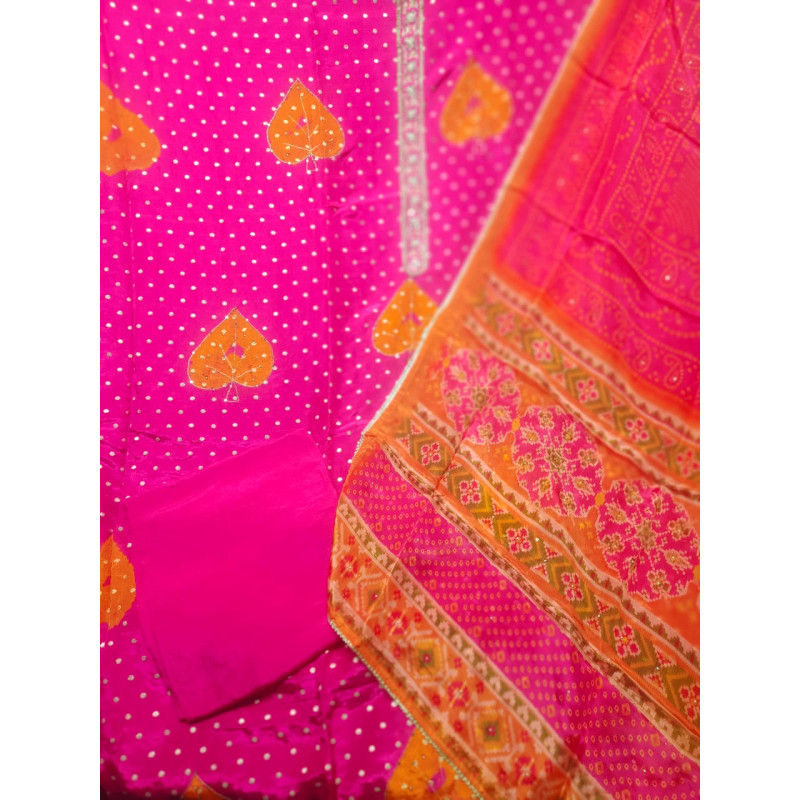 Bright Rani Pink base with Orange Bandhej motifs and Golden Zari accents.