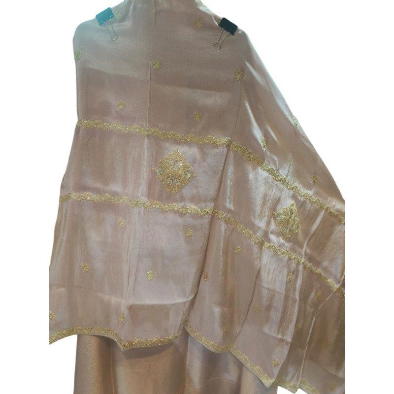Dupatta Heavy Embroidered Organza Fabric: Organza gives a beautiful, structured sheer look. Work: Heavy all-over or border embroidery using Gold Zari (thread work) and delicate Sequins or Cut Dana to make it the statement piece.