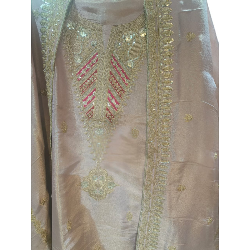A subtle, elegant Soft Peach suit set where the plain top and bottom act as a perfect canvas to highlight the rich, sparkling heavy work organza dupatta. This combination is ideal for weddings, receptions, or festive occasions.